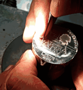 精准激光定位雕刻技术,在纪念章的镜面上雕刻出计算机芯片电路板纹样,来寓意快速成长的电竞行业;核心的金色三角形设计灵感则来源于腾讯电竞的视觉icon ,采用局部镀金技术,三角立体的稳健姿态体现中国电竞的腾飞之势;