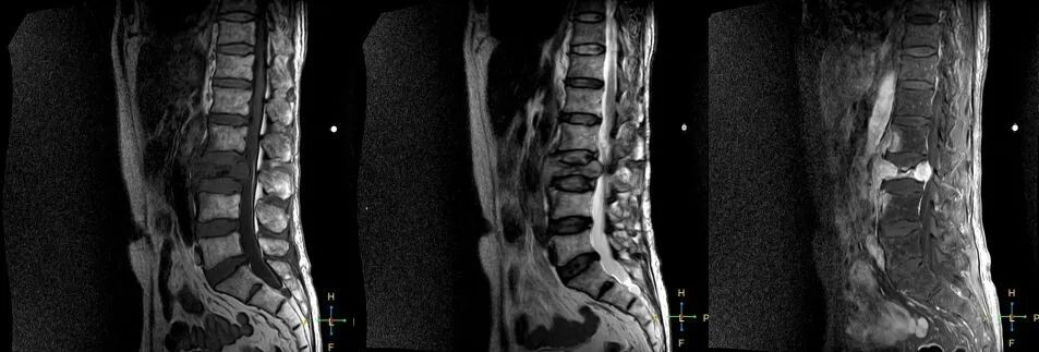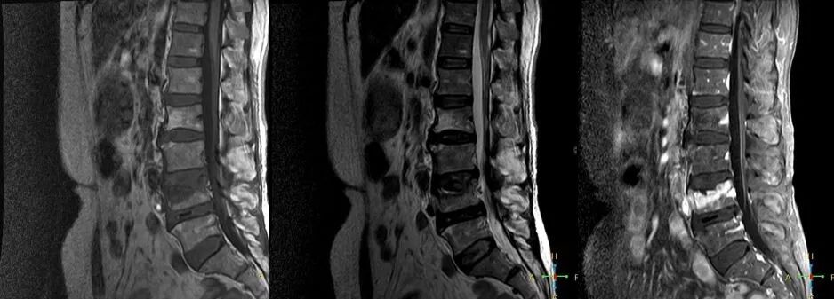 ——恶性压缩性骨折MR信号特点—— 由于肿瘤组织的侵犯,T1WI上椎体呈弥漫性低信号,T2WI呈高信号,增强扫描呈明显不均匀强化。