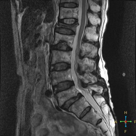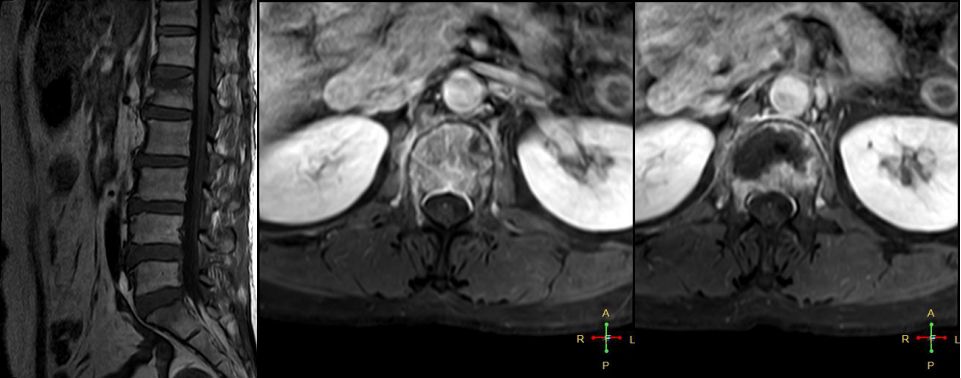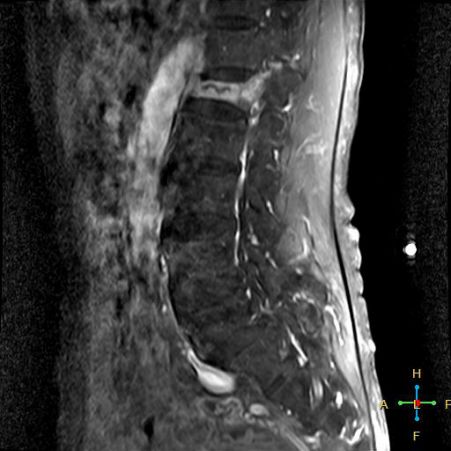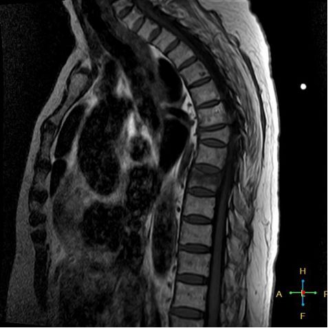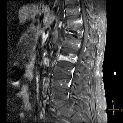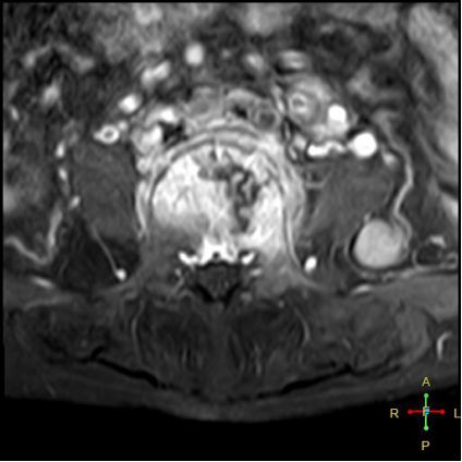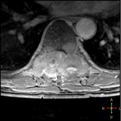 所以,椎弓根的信号改变并非恶性骨肿瘤所特有,约20%~ 30%的良性压缩性骨折会出现椎弓根水肿而信号增高。 恶性压缩性骨折, 约有60%~ 80%出现椎弓根水肿及信号变化,而在椎弓根出现不正常信号的恶性压缩性骨折中, 约有50%~70%出现椎弓根膨大的现象,为其特异性, 可作为鉴别诊断的依据。 椎旁软组织肿块:最典型的表现为椎旁一薄环状异常信号带,因为椎体压缩时常继发椎旁软组织水肿与出血, 这一征象多见于单纯骨折, 病理性骨折少见。