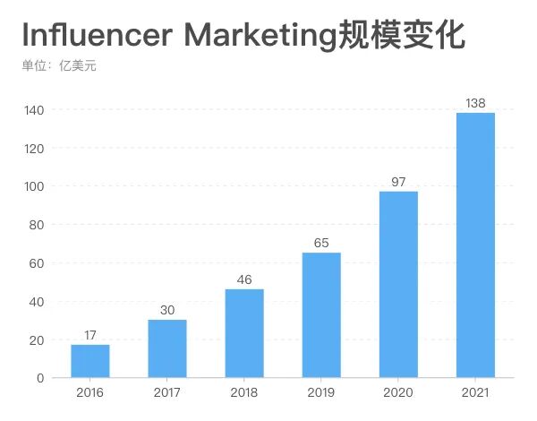 从全球范围来看,达人营销同样也在蓬勃发展。 在海外,达人营销普遍以Influencer Marketing(影响者营销)代称。 InfluencerMarketingHub发布的一份报告显示,影响者营销市场规模将从2016年的17亿美元增长至2021年的138亿美元。仅在2019年,就有超过240家专注影响者营销的新服务商和新平台成立。