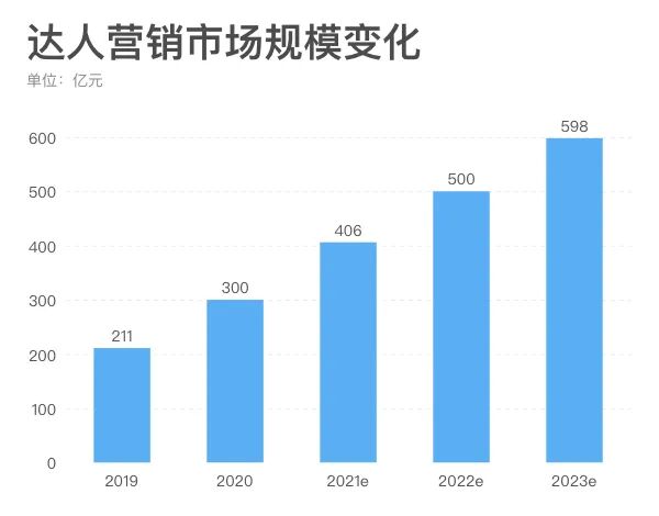 巨量引擎达人营销与创意生态负责人嵇鹏飞提到,目前达人生态已经足够多样化。不同于早期纯颜值达人的单一化趋向,眼下的达人生态已经可以划分出166个细分垂类。 规模化态势下的‘精细化’,嵇鹏飞用这句话来概括达人生态的现状。具体而言,意思是达人规模已经足够庞大,庞大到可以让赛道分得越来越细、越来越精。 艺术家安迪·沃霍尔曾说:未来,每个人都有15分钟的成名机会。 这句话也是当前达人生态的注脚。不需要全方位突出的能力,只要在某个领域拥有一技之长并愿意展示出来,任何人都有机会获得数量可观的拥趸。 对年轻人来说,这真是一个机遇遍地的好时代。 2 300亿市场 达人生态的日益丰富催生了巨大的达人营销市场。 巨量星图达人节上披露的数据显示,2019年,中国的达人营销市场规模为211亿,这个数字去年增加了42.1%至300亿元。 据预估,随后三年的达人营销市场规模还将分别增长至406亿元、500亿元和598亿元,复合年增率接近30%,是一个基数不小且仍在快速增长的市场。