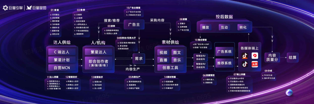 某种程度上,当前的星图优选可以被视为巨量星图平台为达人营销搭建的VIP室,跻身其中的品牌方、MCN、达人和服务商将获得更多服务。 例如首期加入的1000家品牌将在传播方案策划、达人前选策略、履约沟通执行、专属审核通道等方面获得专属服务;另外,首期50家服务商也将在平台能力、服务费激励、资金支持等方面得到充分保障。 从目前宣布的各项政策和思路来看,虽然星图优选更像是名额有限的VIP室。但实质上,它也是巨量星图在达人营销领域探索的试验田。 通过在头部品牌、达人和服务商上不断进行创新模式和产品的检验,那些被反复验证成熟的标准化服务能力未来也会开放给所有参与方共享,巨量星图平台由此也能够持续增添能力。 事实上,巨量星图平台三年间的变化,也是达人营销整体发展的缩影。 从最初为线下合约交易提供保障,到后续通过系统批量化精准筛选和撮合达人,再到眼下协助企业实现投放效率提升、帮助达人获得快速成长,达人营销的内涵不断外扩并支撑起日渐庞大的市场规模。 4 搞定112位达人 现在的达人营销能有多复杂?汽车品牌极狐可能最清楚。 几年前,广告主往往只需要选择3到5个达人就能够完成一次营销活动;但极狐在一款新车上市时,总共选择了112位达人进行合作,涵盖7位顶级大咖、72位汽车垂类达人和33位跨界达人。 和百名达人合作,不可能靠人工筛选。极狐与巨量星图共同建立了一套模型,涵盖感性指标、理性指标和增长性指标等三个维度,最终才搭建起这个庞大的达人宣传矩阵。 类似情况也出现在上汽大众,它在过去一年累计合作了1000位达人,而这背后同样需要先进技术的介入和支撑。 在达人营销这个偏内容的领域中,技术到底发挥了多大的作用?下面这张图让我对这个问题有了新认识。从搜索、推荐、流量、度量到分成,13个环节中的每一个都需要多项技术支撑。