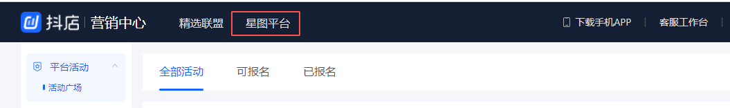• 进入抖店商家后台https://fxg.jinritemai.com/index.html/index/home,点击营销中心——星图平台——开启星图平台进行注册或登录
