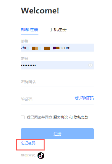 若后续忘记密码,可在此注册页面点击忘记密码进行修改