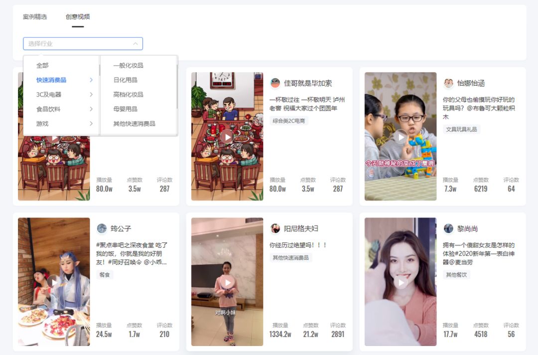 另一方面,案例中达人对于内容创作经验的分享深度解析了解爆款短视频的策划及创作过程,能够有效帮助达人和客户掌握短视频运营技巧,提升优质内容产出率,让产品的推广更加高效。 创意视频所展示的是由达人独立上传的优秀作品(暂时根据发布时间排序),客户或达人同样可以根据行业及细分品类进行选择观看。