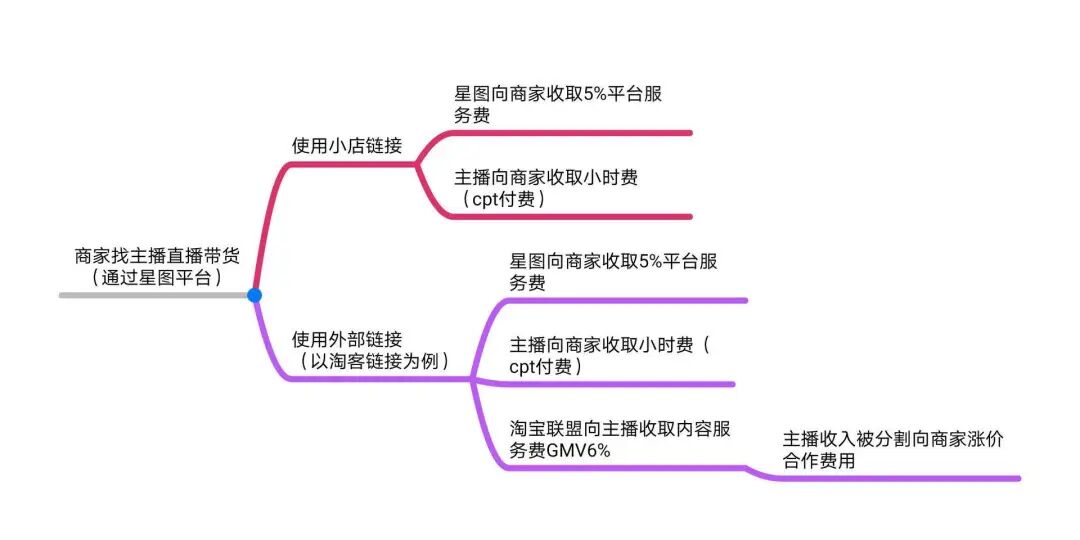 如果商家使用的是淘客链接,将抖音流量引流至天猫/淘宝完成收割,一方面星图会向商家收取平台服务费(cpt付费总额的5%)、主播会向商家收取cpt费用(直播时长费),另一方面,淘宝联盟则会向淘宝客(也即抖音主播)收取GMV的6%作为内容服务费。