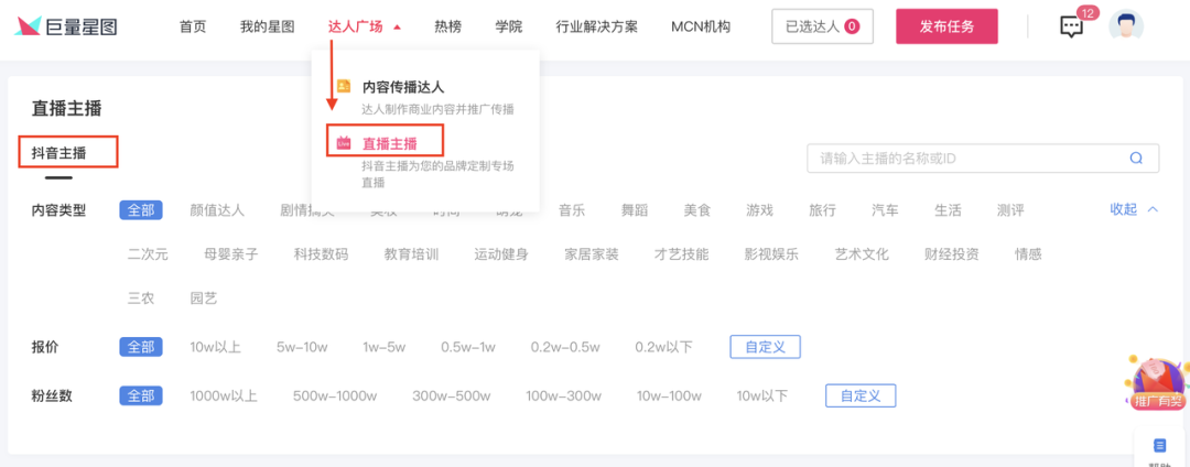 据介绍,未来,巨量星图中的直播服务将覆盖抖音、今日头条和西瓜视频等平台的全部主播资源。而本次上线的1.0版本仅开放抖音主播资源(首批抖音Top直播达人已入驻)。品牌商通过我的星图--直播主播--抖音主播路径即可找到相关服务。