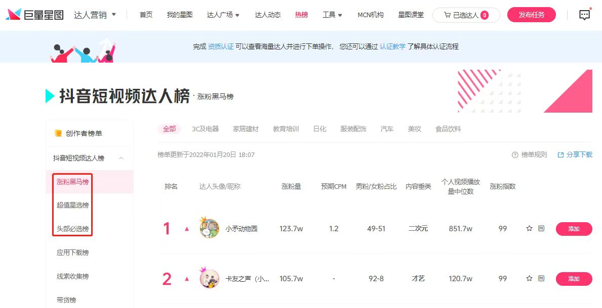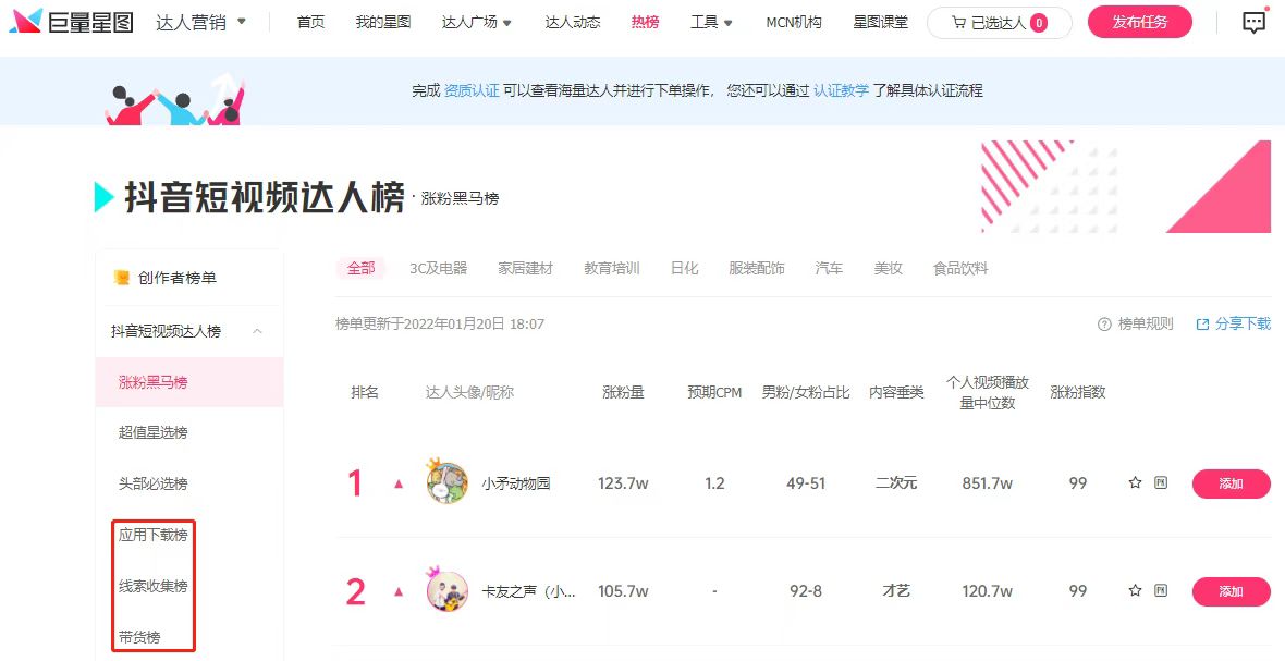 特别值得注意的是,在创作者榜单-抖音短视频达人榜中,新增了「涨粉黑马榜」、「超值星选榜」、「头部必选榜」、「应用下载榜」、「线索收集榜」、「带货榜」6大榜单,并根据对应星图指数和过往数据进行排名。