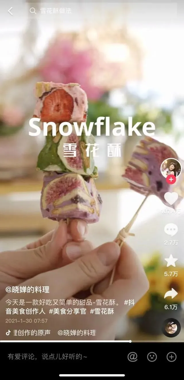 最终,他们做了3种治愈系颜色的雪花酥,包括粉丝、紫色、绿色,并和粉丝互动,告诉他们怎么做才不会翻车,什么时间放哪些食材不会糊锅……视频发布后,他们惊喜地发现,播放量竟然高达5000多万,当时一天也涨了5万左右的粉丝。