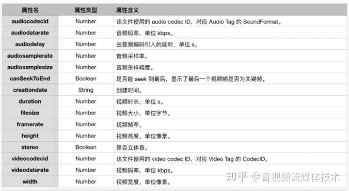 onMetadata 包含着不同的属性,这些属性对于不同的 FLV 文件可能各不相同。