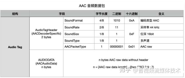 通常在 AudioTagHeader 后面跟着就是 AUDIODATA 数据了,但是对于 AAC 格式的音频数据来说,AudioTagHeader 会多一个字段 AACPacketType 来表示 AACAUDIODATA 的类型:如果 AACPacketType 为 0,那么数据对应的是 AudioSpecificConfig;如果 AACPacketType 为 1,那么数据对应的为 Raw AAC frame data。