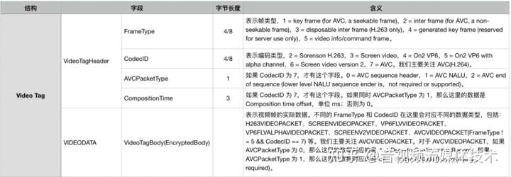 Tag 中包含着 audio、video、scripts 的元信息,加密信息(可选)以及对应的实际数据。