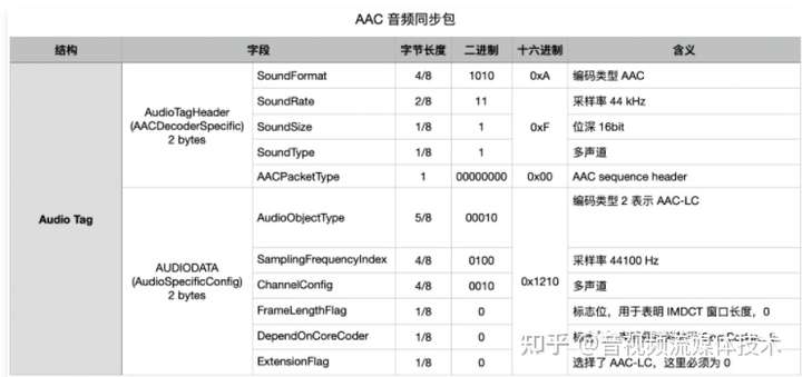为什么 AudioTagHeader 中已经有了音频的相关参数,还需要在这里来一个 AudioSpecificConfig 呢?这是因为当 SoundFormat 是 AAC 时,SoundType 需要设置为 1(立体声),SoundRate 需要设置为 4(44k Hz),但这并不说明文件中 AAC 编码的音频必须是 44k Hz 的立体声。播放器在处理 AAC 音频时,需要忽略 AudioTagHeader 中的音频参数,而使用 AudioSpecificConfig 的参数来初始化解码器。