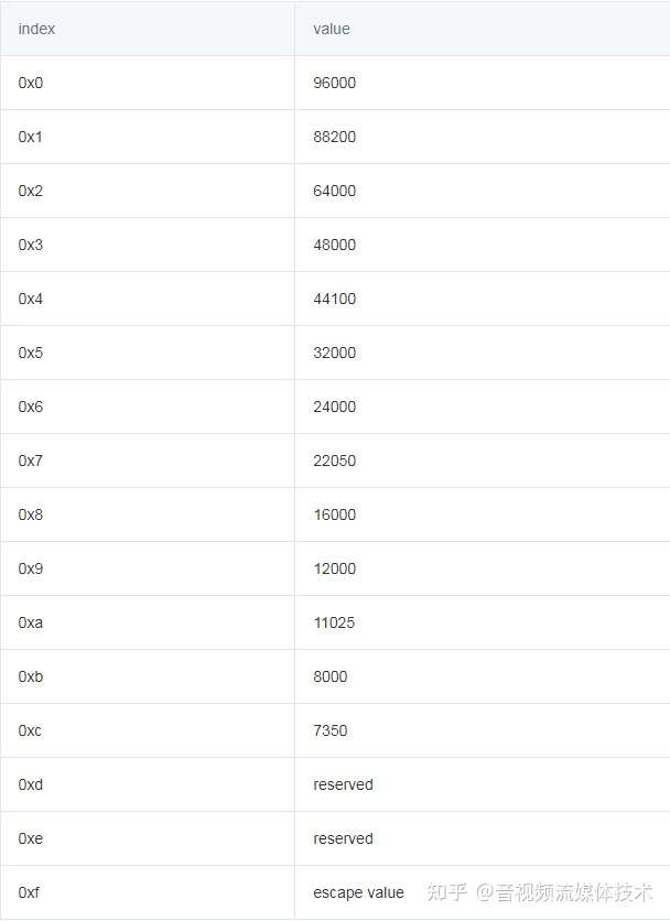 下面是ISO/IEC 14496-3, 1.6.3.4 samplingFrequencyIndex: