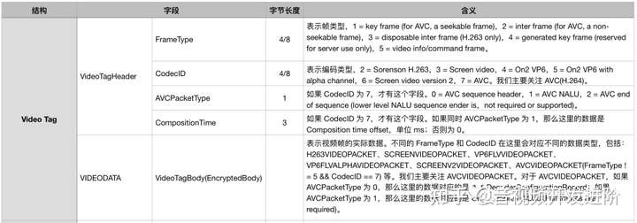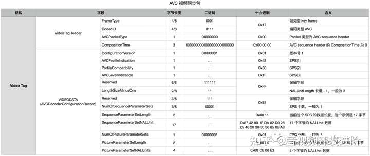 在 FLV 的文件中,一般情况下 AVCDecoderConfigurationRecord 只会出现一次,即第一个 Video Tag。如果视频使用 AVC,那么这个 Tag 就是 AVC sequence header,即 AVC 视频同步包。AVCDecoderConfigurationRecord 结构的在ISO/IEC-14496-15 AVC file format标准中有做说明。