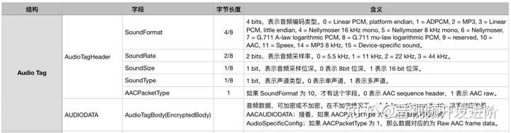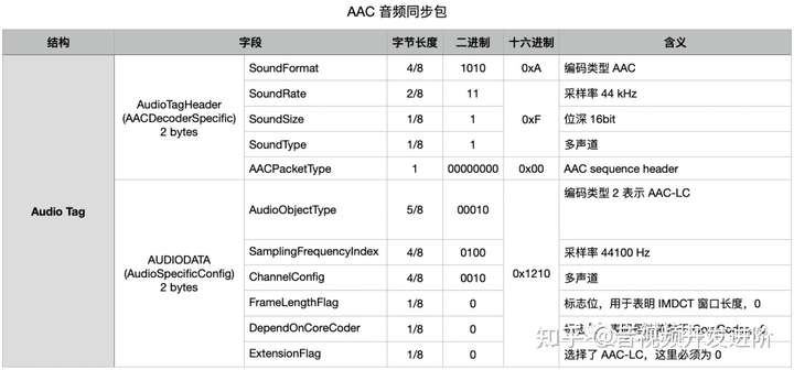 为什么 AudioTagHeader 中已经有了音频的相关参数,还需要在这里来一个 AudioSpecificConfig 呢?这是因为当 SoundFormat 是 AAC 时,SoundType 需要设置为 1(立体声),SoundRate 需要设置为 4(44k Hz),但这并不说明文件中 AAC 编码的音频必须是 44k Hz 的立体声。播放器在处理 AAC 音频时,需要忽略 AudioTagHeader 中的音频参数,而使用 AudioSpecificConfig 的参数来初始化解码器。