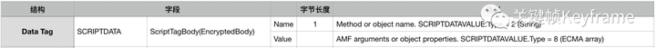 其中 ScriptTagBody 中的 Name 和 Value 字段都是 SCRIPTDATAVALUE 类型。Name 最终对应的是 String 类型,Value 最终对应的是 ECMA array 类型。