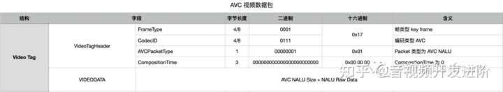 如果 AVCPacketType 为 0,那么这里的数据对应的是 AVCDecoderConfigurationRecord;如果 AVCPacketType 为 1,那么这里的数据对应的是 One or more NALUs(Full frames are required)。