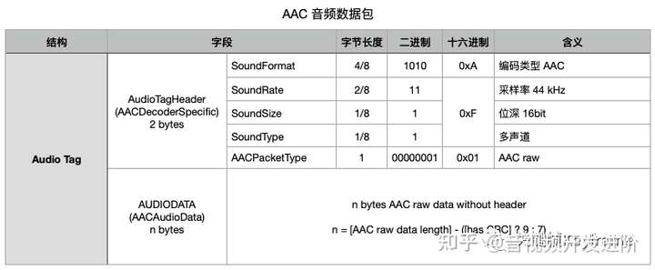 通常在 AudioTagHeader 后面跟着就是 AUDIODATA 数据了,但是对于 AAC 格式的音频数据来说,AudioTagHeader 会多一个字段 AACPacketType 来表示 AACAUDIODATA 的类型:如果 AACPacketType 为 0,那么数据对应的是 AudioSpecificConfig;如果 AACPacketType 为 1,那么数据对应的为 Raw AAC frame data。