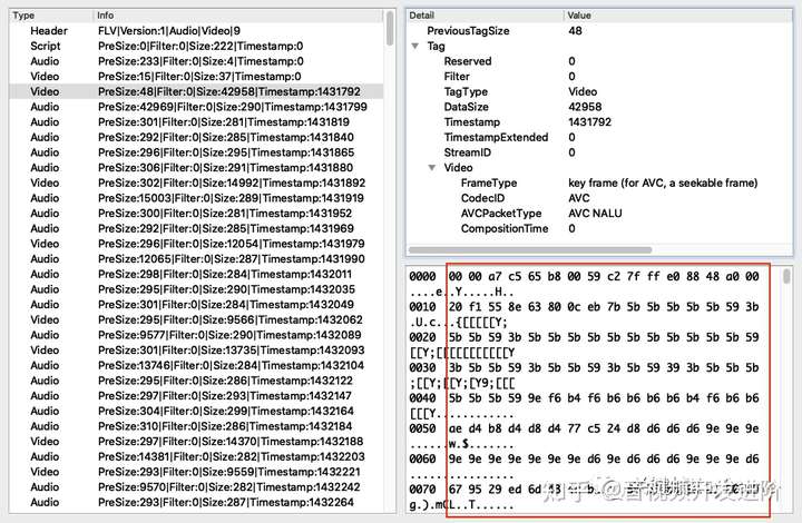 下图是一个 AVC 视频数据包的示例,其中红框部分对应的是 VIDEODATA:
