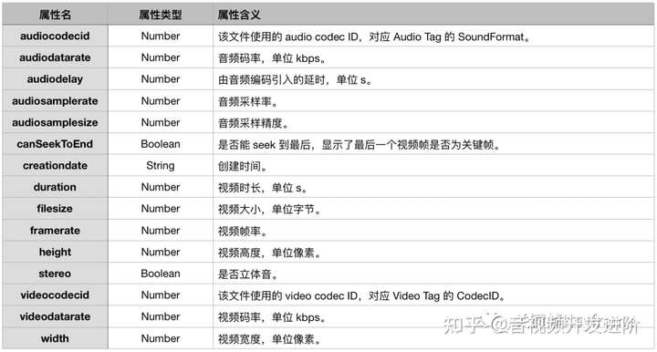 onMetadata 包含着不同的属性,这些属性对于不同的 FLV 文件可能各不相同。