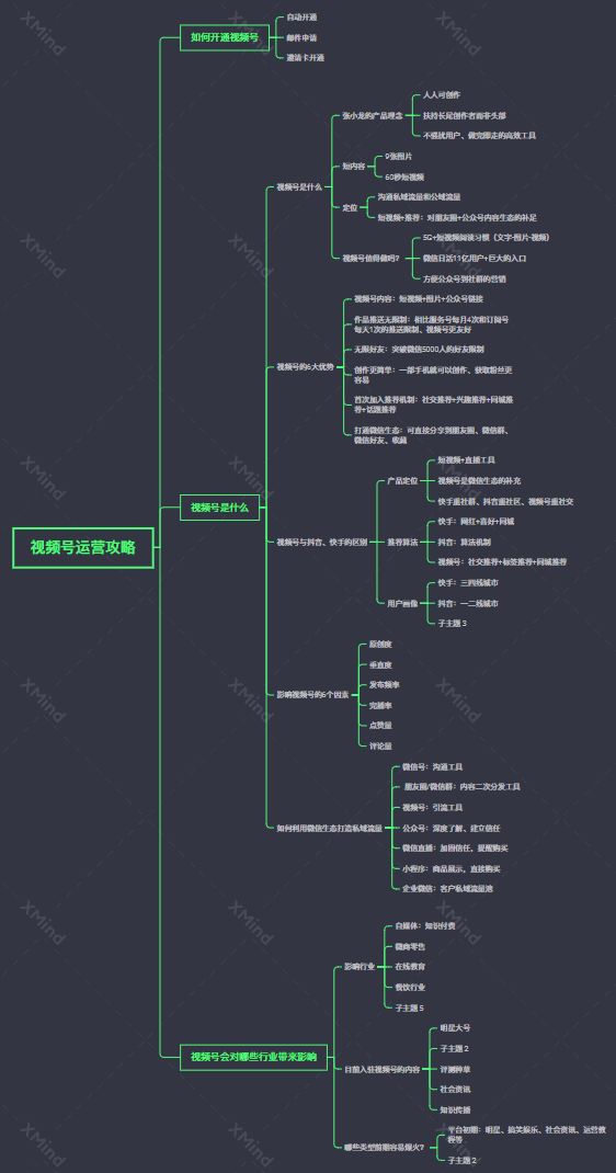 2、邮件申请 选择邮箱申请: 发送到 channels@tencent.com 格式如下: 邮箱主题:申请开通视频号 微信号:**** 邮箱 :**** 个人身份证:**** 电话:**** 影响力证明:****(尽量写各大平台的粉丝数,影响力截图等) 专属邀请码:**** 专属邀请码:(公众号后台回复邀请码)即可获取 附上专属邀请码,可获得加速审核的资格。 3、邀请卡邀请开通 目前这种方法问的人比较多,这里统一回复一下。 微信团队推出了已开通视频号的账号可拥有三张邀请卡,邀请已成为好友三个月以上的朋友开通视频号。 但是这里要强调一下,目前拥有邀请卡的账号是极少的,大部分已开通视频号的朋友都没有邀请卡。 4、微信团队内邀 这种方式是指在视频号灰度测试期间,系统会优先开通那些活跃账号的视频号发布权限。所以这里也十分建议大家,可以多活跃账号,点赞和评论都可以提高账号活跃度。 最后,给大家整理了一份视频号运营攻略导图,大家先看一下。