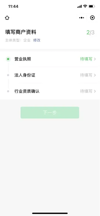 step2:用户依据提示,提交商家主体资料(营业执照、身份证、经营许可证等基本信息);