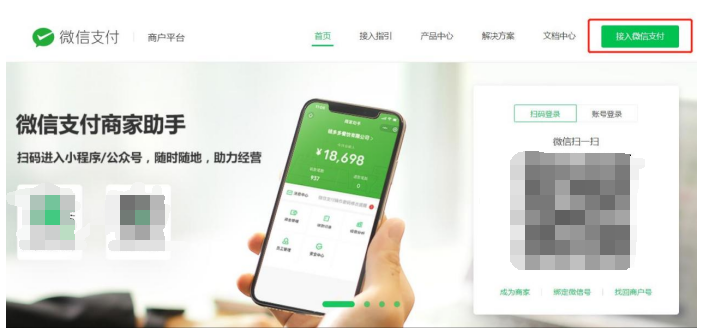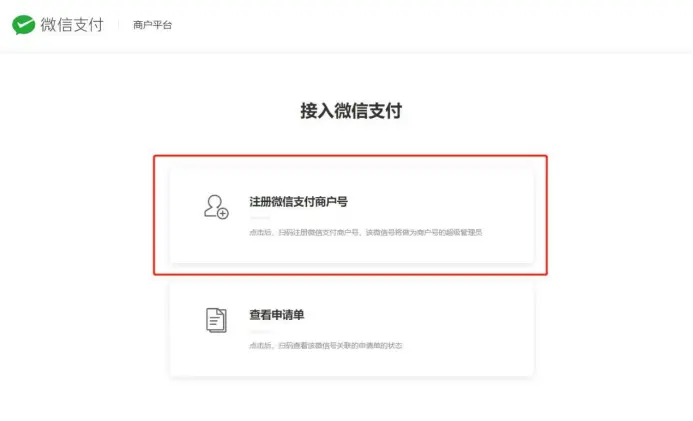 step2:进入平台后,点击右上角的【接入微信支付】-【注册微信支付商户号】;