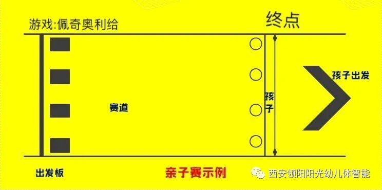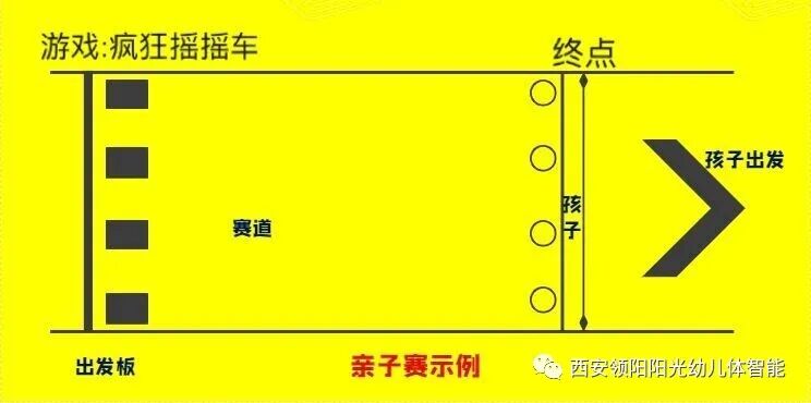 四组家庭为一小组。家长需面向出发板坐下,小朋友垮坐在家长腰上,双手抱紧家长脖子,出发音结束后家长背向终点像划船一样带着小朋友出发,到达终点后抱起小朋友上车,小朋友骑车自行出发。