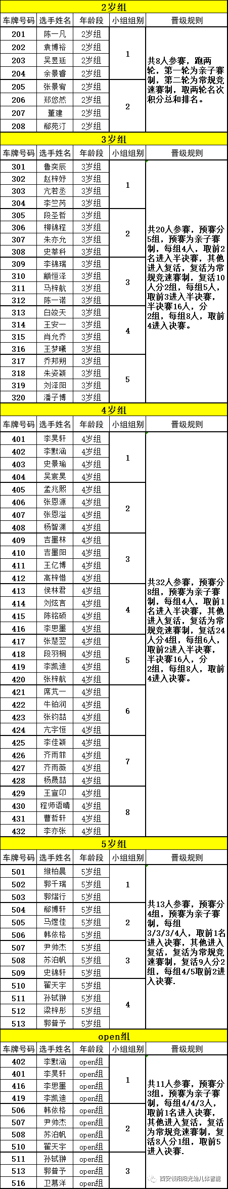 (4)签到需由家长完成,请各位家长按照选手所报的年龄组按顺序签到。各年龄组分为若干小组,具体小组标号统一由现场工作人员告知。