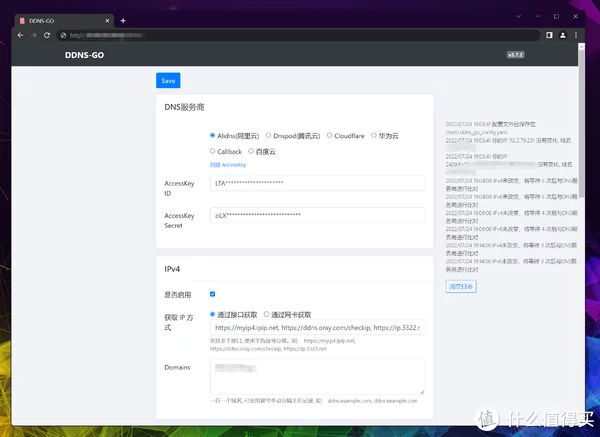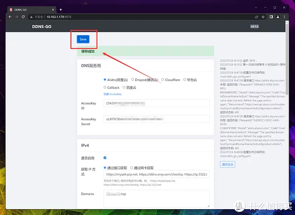 回到ddns-go后台,将ID和Secret填入: 由于这台NAS并没有直接拿到IPv4的公网IP,所以接口选择通过接口获取,Domains填写你购买的域名。 IPv6就不一样了,因为这台NAS的上联路由器支持给每一台下联下发独立公网IP,所以这里选择通过网卡获取,Domains还是填写你购买的域名。 全部确认无误后,点击保存即可,左侧会有日志提示,下图就是域名填写错误导致无法正常解析。 正确解析应该如下图所示,可以内网IPv4+公网IPv6使用同一个域名,非常方便。 回到阿里云后台也能查看到这台绿联DH2600的IP,解析成功。 以后就可以通过域名+端口号的方式访问NAS上容器,不仅受局域网限制。PS:部分环境由于路由器问题,本地局域网用域名访问可能会失败,拿手机网测试下即可。 拓展后续其实想做个多种外网访问方式的合集,经过测试发现NAS并没有开启TUN功能,导致Zerotier和Tailscale能部署但是无法创建虚拟网络进行SD-WAN组网,所以目前外网访问还是用域名解析IPv6配合绿联自己的内网穿透方便一些。 如果舍不得每年续费买域名,设备不多的话可以选择入手贝锐家的蒲公英路由器组SD-WAN,毕竟是一次性付费用着还简单,也是不错的选择。 |