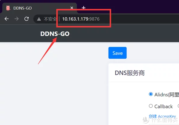 特别注意:这个IP是NAS上联路由器为NAS分配的内网IP,并非出口公网IP,完全两回事。 综合上面两个信息,可以得出ddns-go的web页面地址应该是: 10.163.1.179:9876
