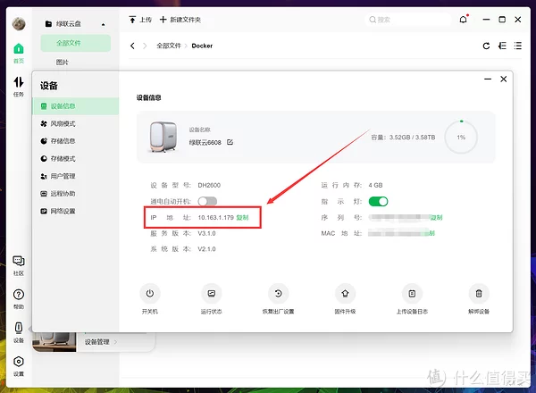 NAS的IP在绿联云客户端主页面点击左下角设备,再点击设备管理即可查看。 在设备信息中可以看到IP,我这里是: 10.163.1.179
