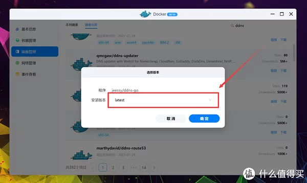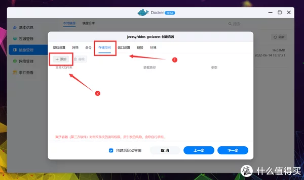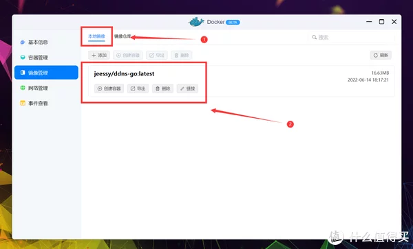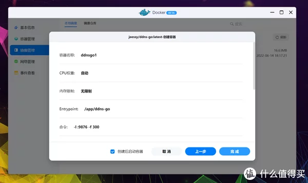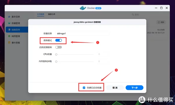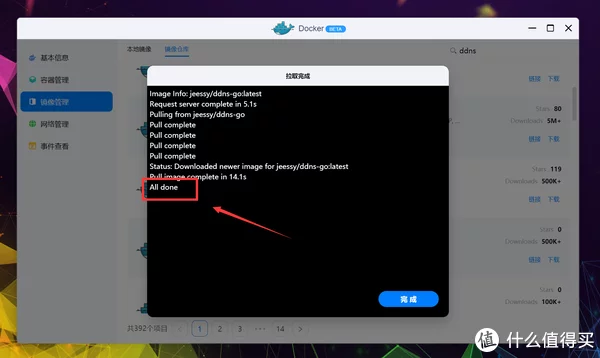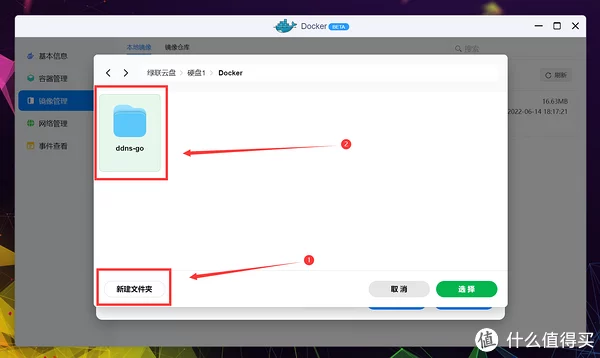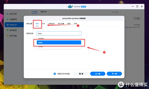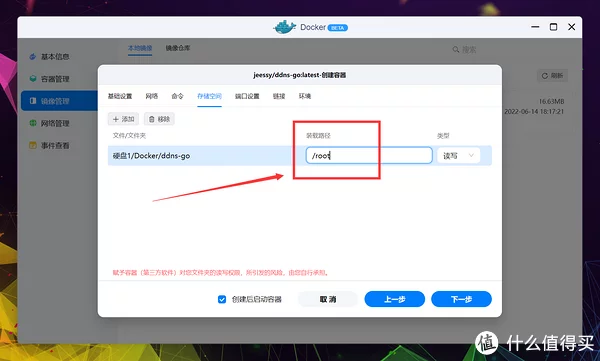 不过UI表达和操作上简化了很多,更适合绿联轻NAS的定位。 仓库源依旧是世界上最大的平台DockerHub,可以放心食用,不用担心资源缺失,搜索并找到jessy/ddns-go,双击下载。 接下来选择标签(Tag),由于绿联DH2600是X86架构,所以正常用默认的最新(Latest)即可,其他容器一般也这样。 估计是还没来得及做的缘故,绿联将下载进程直接以Terminal方式呈现,提示All done表示镜像下载完成,点击完成退出页面。 点击本地镜像即可查看刚下载好的容器镜像,点击创建容器开始部署。 PS:部署完容器后镜像也不能删除,切记别动它。 进入创建流程后先是基础设定,由于DDNS服务非常重要并且需要调用到很多模块,所以这里勾选上高级模式,顺手勾选上创建后启动容器。 根据上一段的代码说明,ddns-go需要将网络模式改为Host(使用宿主网络),点击网络名称更改下就行。 点击存储空间的添加,准备开始配置文件夹挂载。 这里我选择创建一个名为ddns-go的文件夹,用于挂载容器的配置文件,新建完成后选择确认。 装载路径按照项目说明,填写: /root