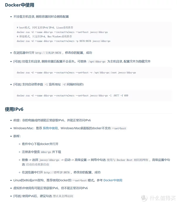 根据项目说明,该容器的部署代码及对应功能如下: docker run -d(-d有没有无所谓,对应下载并部署docker) --name ddns-go(--name对应命名,这里是将容器命名为ddns-go) --restart=always(--restart对应重启规则,这里是一直自动重启) --net=host(--net对应网络选项,这里是将使用网络模式配置为host) -v /opt/ddns-go:/root(-v前缀对应挂载,这里是将容器的/root文件夹挂载到系统/opt/ddns-go文件夹) jeessy/ddns-go(对应镜像名称)