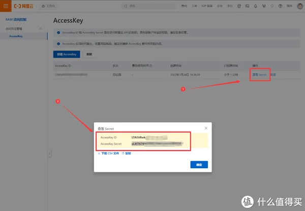 PS:首次需要实名认证,提交申请后要等大约24小时的审核时间,审核通过后方可购买。 验证并购买成功后,进入阿里云的后台,创建一组access Key后查看Secret: https://account.aliyun.com/login/login.htm?oauth_callback=https%3A%2F%2Fram.console.aliyun.com%2Fmanage%2Fak&lang=zh