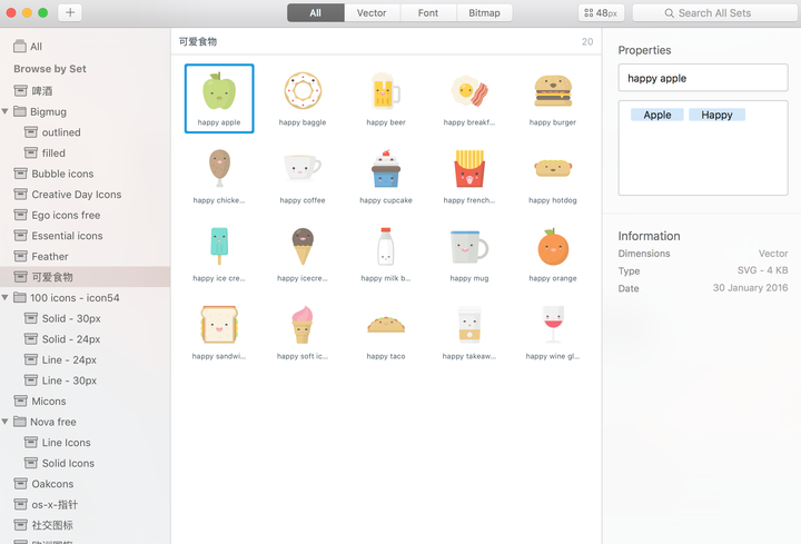 5.Instantlogosearch(只提供Logo,国内大厂的也有,覆盖挺全的)  6.附图标提取小技巧 ▌从网页里提取: 在百度里搜索【某个应用程序+Apptore】例如【微信 Appstore】 然后右键打开「检查元素」 →Network → Img → 搞定 ▌从APP里提取: 先打开「预览」程序  然后在 Finder将目标应用从应用程序列表拖至Dock 栏上的「预览」  ▌Mac 的符号输入面板 快捷键「control+command+空格」打开系统内置的符号输入面板  管理工具:iconjar 支持 SVG、PNG、Gif 三种格式的图片。建议大家去官方下载官方素材库资源时候尽量导入svg格式,毕竟是矢量的,以后改着也方便。 选中某个图标,侧边栏会出现名称和标签,当然不需要的右边栏话也可以在菜单栏隐藏.  偷懒姿势: 1. 下载图标并安装:官方素材库 2. 使用时直接把图标拖进sketch或ps 里,搞定。