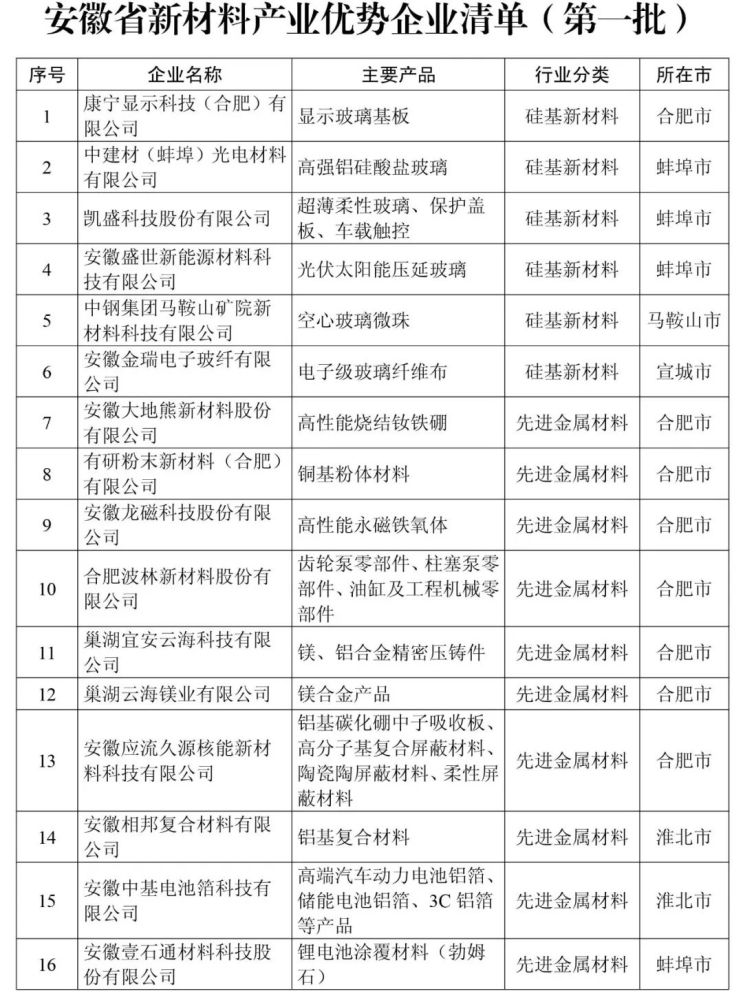 【招商引资内参正文】 安徽省新材料产业优势企业清单(第一批90家)