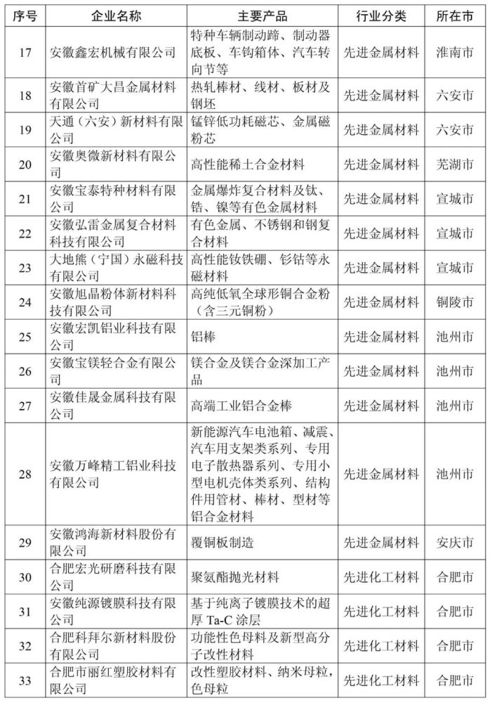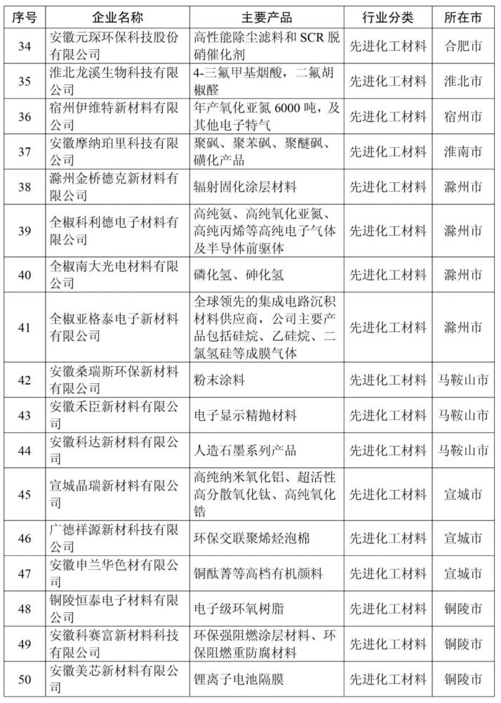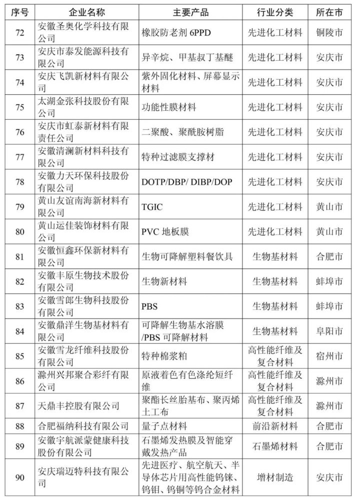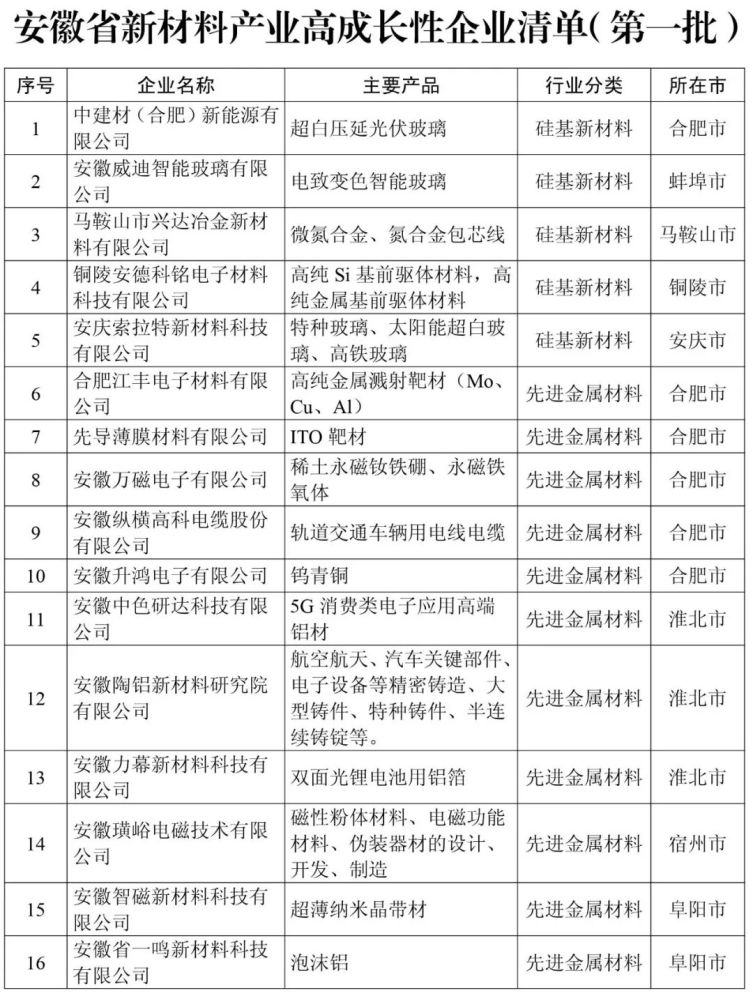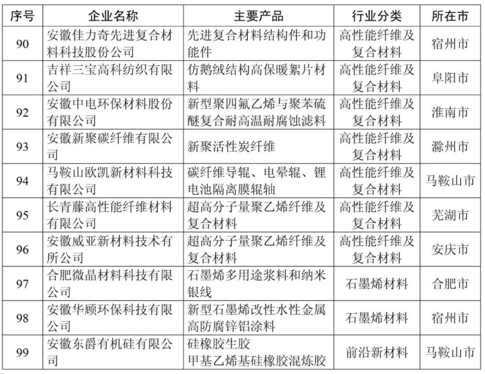 安徽省新材料产业高成长性企业清单(第一批99家)