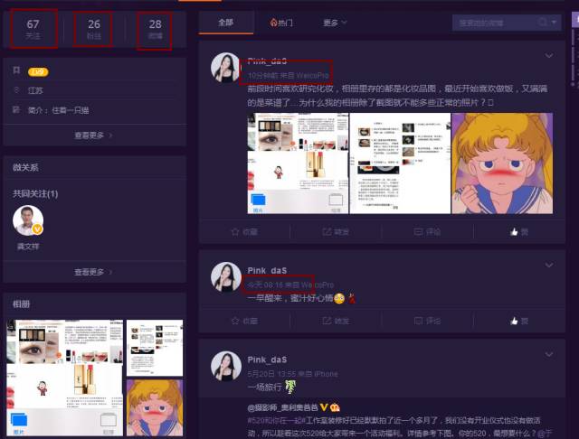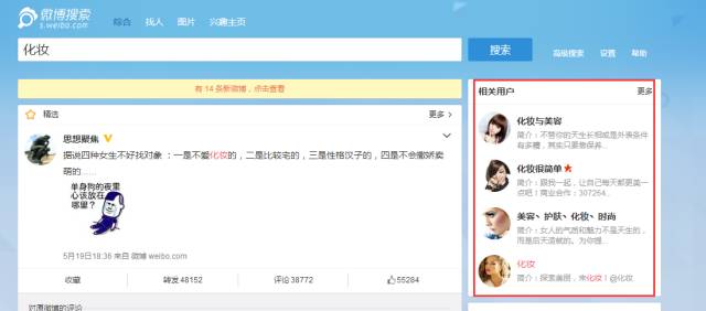 很多人都在寻找推广方法,有时候擅用其他平台是个很不错的主意。 很多人已经开始建立了公众号,所以公众号的运营与推广就变的很重要了。但是,在做推广之前,公众号首先必须要有内容。不然,人家关注了都不知道看什么。 我们都说,手机端有两微,一个是微信,一个是微博。 截止2016年第一季度,根据公开的数据,微信的月活跃用户7.62亿,当然是包括海外的。微博的月活跃用户达到2.61亿,日活跃用户1.2亿。 所以,两个社交软件,你可以相互引流。具体可以根据你的产品或者服务来选择是将微博引到微信还是微信引到微博,不过,以目前的情况来说,还是微博引到微信。 所以,我就自己去看了看微博,研究了下,果真找到了一些引流方法。 我以化妆这个词搜索。出现了截止目前我所发现的可以引流的方式。 一、直接从微博网友的图文状态里寻找目标客户。