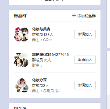 看到没?你可以把你写的有个护肤的东西进行投稿。为什么找粉丝数比较少的呢?因为她们需要原创内容,投稿之后的录用率就大很多,当你投递的多了,是不是曝光量就多了? 然后,有些微博左边下面还有粉丝群,你也可以加入进去。然后根据群的质量与其他东西来进行营销。