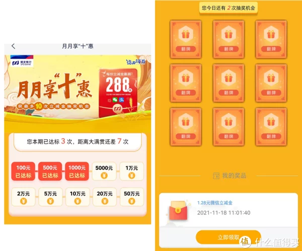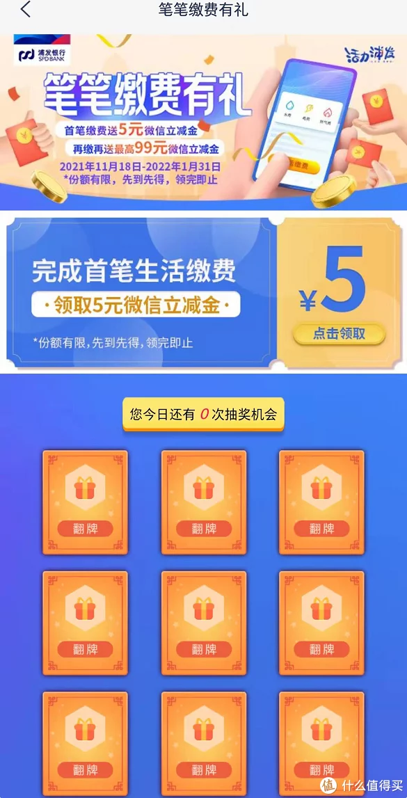 作者:66主人翁 注意,本文介绍的是浦发银行APP,借记卡(储蓄卡)活动,不是喜大浦奔浦发信用卡的活动。 一、【>6元微信立减金】浦发卓信财富号登录浦发银行APP,在首页轮播图点击蓝色浦发卓信财富号 导航栏图片,进入活动,页面共6个财富号每个关注后抽奖,目前每个必中1元以上微信立减金。注意,立减金奖池有限,领完就没了。全部关注完还可以增加一次去抽奖机会,RP爆发可得苹果13一部(大概率空气)。 活动规则 1、活动时间:2021年11月18日-2021年11月27日 2、本次活动分为关注礼和抽大奖两项。 3、关注礼:活动期间,客户每关注一个财富号,即可获得一次抽取微信立减金的奖励机会(最高88元,名额有限,先到先得)。每个客户最多可获得6次关注礼抽奖机会,重复关注同一财富号仅可获得一次抽奖机会。 4、抽大奖:活动期间,客户关注6家财富号后,可再获得一次抽取苹果手机大奖的机会。本次抽大奖活动每天设一部苹果iPhone13手机(128G,颜色随机)作为奖品。 二、【>10元微信立减金】月月享十惠这个活动的入口挺多,在首页轮播图点击红色月月享‘十’惠 导航栏图片,进入活动。当月浦发银行借记卡累计支付金额100至50W不等,可得最多10次微信立减金机会,每次必中大于1元。支付是累加的,比如当月支付达1000元,可以抽100、500和1000三档,共三次机会。 领取微信立减金时,不小心关闭了领奖页面,可以在活动页面滑动到我的奖品,点击立即领取可重新领用: (一)、活动时间: 2021年11月1日-2021年11月30日 (二)、活动内容: 活动期间,用户通过支付宝/微信支付使用浦发借记卡完成支付且未发生退款,当月累计支付金额每达到以下对应档位金额,即可于24小时后获得1次抽奖机会,抽取最高288元微信立减金一份。同一用户最多可获得10次抽奖机会,活动名额有限,先到先得,领完即止。 抽取时间:累计支付金额达到对应档位 24小时后(截止12月2日24点) 参与地址:浦发银行APP-生活-热门活动-月月享十惠——11月 三、【5元微信立减金】笔笔缴费有礼在浦发银行APP的最底部的生活页面点击生活缴费,用浦发借记卡缴一笔大于或等于20元的水、 电、燃等生活缴费。缴费完成后在生活页面的"热门活动"的笔笔缴费有礼可以领取5元微信立减金,注意奖池份额有限,发完就没了。 活动时间: 2021年11月18日起至2022年1月31日 活动内容: 活动期间,客户每个月通过浦发银行手机银行APP、网上银行、VTM自助终端、网点柜面等渠道使用我行借记卡完成一笔20元及以上生活缴费,即可进入手机银行APP-生活-热门活动-立减金专区,领取一次微信支付立减金。完成首笔符合条件的交易当月领取5元微信支付立减金,次月再次完成符合条件的交易可抽取一次随机金额的微信支付立减金(最高99元)。 参与地址:浦发银行APP-生活-热门活动-笔笔缴费有礼 在浦发银行APP-生活-热门活动,还有首次登录APP专享抽奖\信用卡还款有礼抽奖等,符合条件的朋友可以去试试,不再多作介绍。 |
