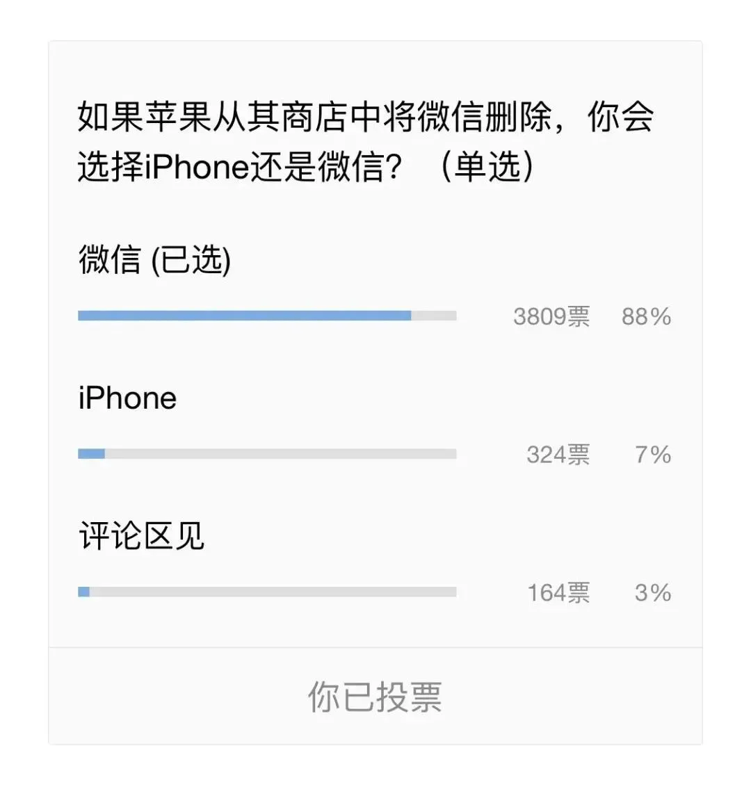 据南方+,在一个受股票投资者欢迎的在线论坛上,用户被问及如果苹果从其商店中将微信删除,他们会放弃iPhone还是微信?投票结果是20比1,决定放弃iPhone手机。