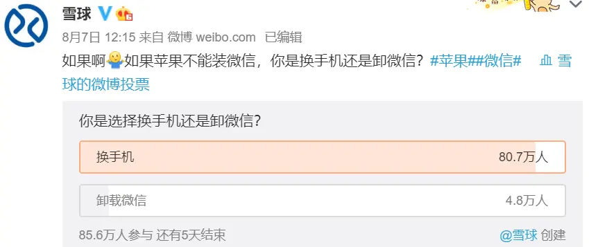 雪球在微博上的调查显示,94%的人选择了换一个手机继续使用微信。