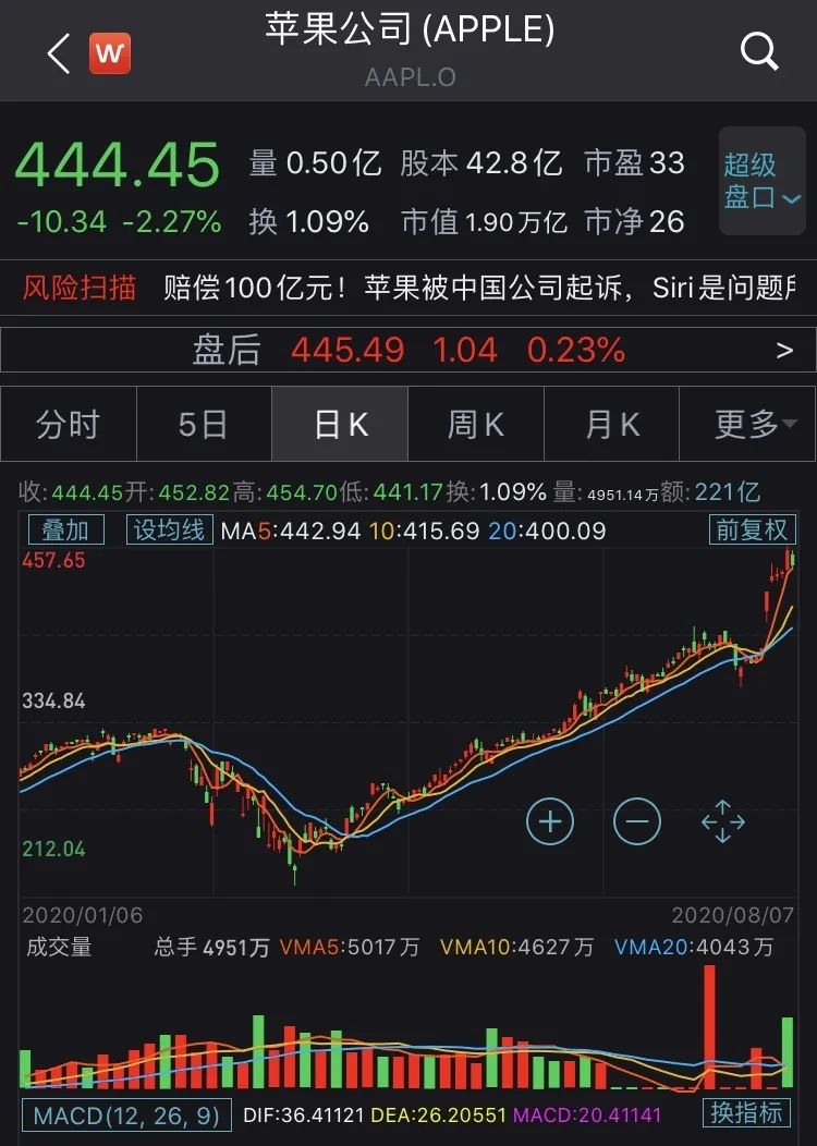 周四(8月6日),苹果公司股价续创历史新高,收盘大涨3.49%,报455.61美元,市值升至1.95万亿美元,距2万亿美元市值仅一步之遥。
