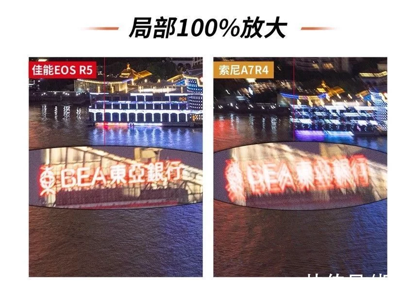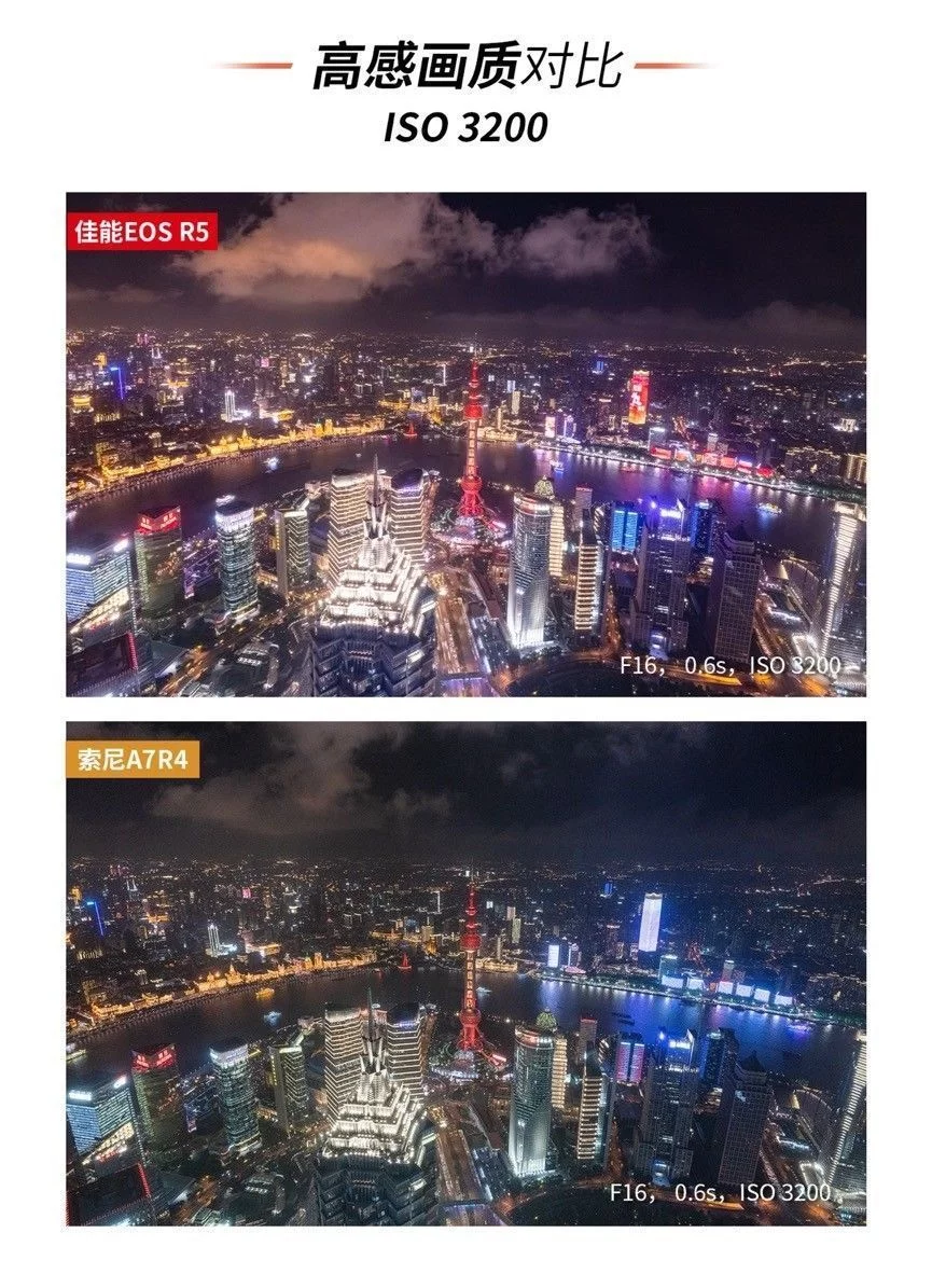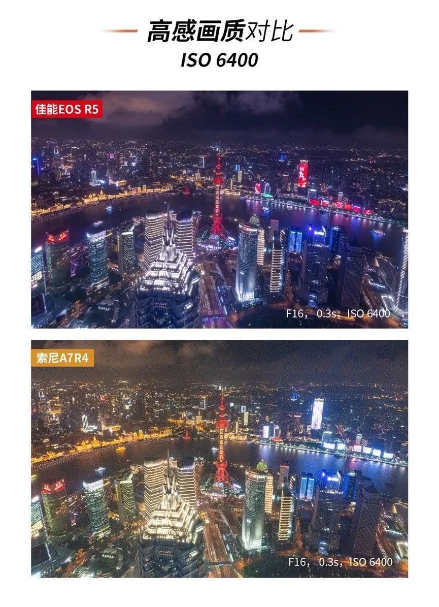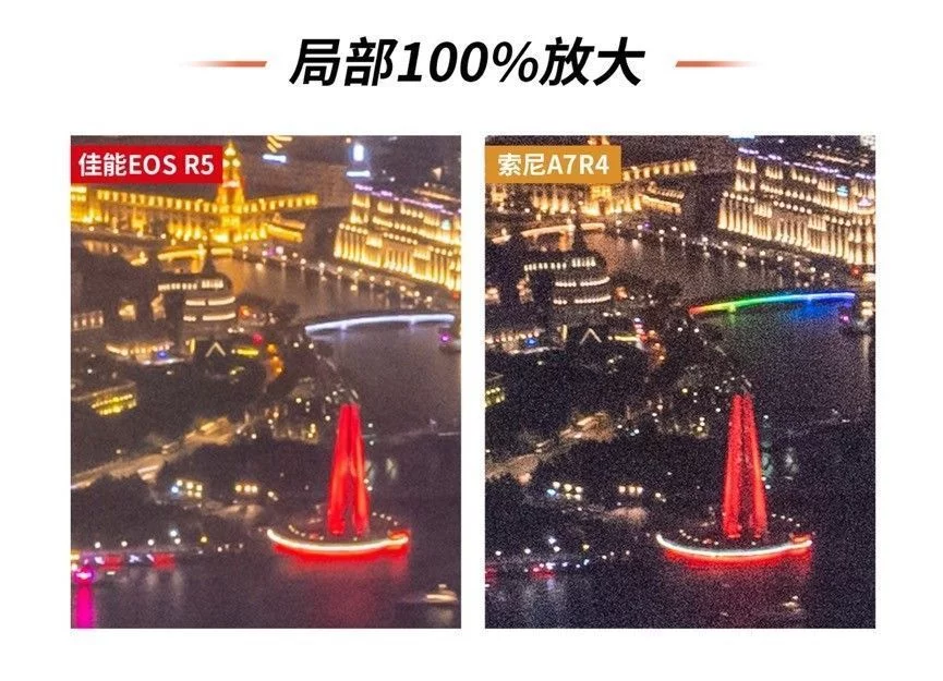 城市夜景是一个宽容度非常之高的摄影题材,专业的摄影师凭借其独特的角度与丰富的后期创意能给予城市夜景一个属于自己的风格诠释。而对于摄影爱好者或摄影小白来说,一台合适的相机搭配上一些预设的相机参数设置,以及适当的配件加持网红拍摄点的定点寻找,同样也能拍摄出令自己满意、令别人惊艳的照片。这个时候或许相机背后的思考并没有专业摄影师那么重要,反倒是手中的相机实用性成了决定性的因素。 既然如此,如何选择一台易用、实用的相机作为城市夜景的创作设备呢?它们需要有高像素去在必要时进行二次的裁切、它们需要有丰富的拍摄角度以应对不同取景下的画面表达。当然了还需要有一定的防抖性能以备特殊环境下的不时之需。 我们将相机的价格限定在2-3万,这个时候佳能的EOS R5与索尼A7R4便瞬间浮出水面。作为这个价位的主流无反相机,我们将对于这两台相机进行相同拍摄环境下的画面比较。同时,我们以魔都上海的一些拍摄限制为参考,通过最常见的夜景拍摄的防抖性能对比、夜景拍摄下的感光度表现以及夜景拍摄下的低角度拍摄可用性这些相对具有决定性的拍摄条件进行比较,那么这两款产品实际性能究竟如何?我们就从第一个防抖性能说起吧。 考验一、手持夜景下的 防抖对比 拍摄地点:上海英迪格酒店——恰咖啡厅 手持拍摄快门速度:1s 在最开始的城市夜景拍摄中,手持拍摄似乎和夜景并没有太多的关联,无论是胶卷相机还是后来的数码相机,人们都是习惯于将相机架设在三脚架上长时间曝光慢慢拍摄。即便拥有光学防抖功能,我们也还是会为了更好的画质而关闭相机的防抖功能。但是现如今手持防抖确实成为了城市夜景拍摄中不可或缺的一个重要功能。因为越来越多的高楼建起,越来越多的拍摄角度在鳞次栉比的高楼大厦的户外平台上。而这些地方都往往有一个共同的规定——不允许架设三脚架。 以我们拍摄取景地上海外滩的英迪格酒店而言就是明文规定不允许架设脚架拍摄的地点。尽管坐拥着极美浦东浦西两岸夜景,但为了楼底下行人的安全考虑此处只能手持拍摄,所以我们第一个考验项目手持拍摄我们就选择在了英迪格酒店。 拍摄样张一: 为了更好寻找参照物我们分别以对岸浦东的香格里拉酒店招牌以及东亚银行的的霓虹灯为拍摄参照物。手持拍摄都以1s为限定条件。两台相机都拥有5轴防抖功能,我们在实际拍摄中也将其各自拥有的5轴防抖打开已进行比较。 在第一项测试中,尽管索尼拥有着相对基础的5轴防抖性能,但是在手持1s的拍摄中还是出现了极为明显的抖动情况。无论是第一张图片中的香格里拉酒店还是第二张图中的BEA东亚银行字眼均无法在照片中得以辨识。而另一方面内置机身防抖功能的EOS R5可搭配实现最高8级的手抖动补偿效果。在搭配具有光学防抖的RF镜头时,机身防抖可与镜头光学防抖联动最高获得8级的手抖动补偿效果,这一点在两次拍摄时都获得了很好的印证。不得不承认在夜景防抖的拍摄对比下,佳能EOS R5显然更胜一筹。 考验二:高感画质对比 拍摄地点:浦东环球金融中心 高感对比其实是一个老生常谈的问题。从有数码相机开始,高感的控噪就成为了每个品牌都必须面对的问题。我们第二次的拍摄考验选择在了浦东环球金融中心的100层观光厅。这里是最好获得浦东夜景的常规景点之一。 相比于那些不太为人所知或者有一定风险性的拍摄地点。浦东环球金融中心,或许是最唾手可得的魔都美景地,但是这个地方同样有一个问题,那便是隔着双层玻璃需要贴近拍摄,尽管可以支撑三脚架但并不太好架设,所以适当的提高感光度成了这里比较常用的拍摄手法,既能避免抖动也可以快速拍摄。我们为了模拟真实的拍摄状态以ISO 800/ISO 1600/ISO 3200以及ISO 6400作为几档基础的拍摄选项进行拍摄,也可以看一下这两款相机在实际应用中的表现究竟如何。 从样图我们不难发觉,尽管索尼A7R4有着6100万有效像素的全画幅传感器,但这也成为了这款相机在弱光下以及高感下的一个死穴,佳能EOS R5尽管在ISO3200的情况下也出现了不同情况的噪点,ISO6400下有着些许色彩损失,但在控噪方面表现依然不俗。但是反观索尼A7R4在感光度为ISO1600的情况下噪点以及色彩损失都开始急速增加,而当感光度达到ISO6400时,画面质量已经下降到几乎不可用的状态。尽管有着高像素的加持,但是只能说是参数上的优势,夜景下的真正应用性几乎为零。 为了可以更好的客观对比,于是我们又寻找了几个拍摄机位,希望能有一个更全面的对比。在外滩的打卡地我们进行了又一次的尝试。 但实际的效果索尼的A7R4还是很难突破ISO6400临界点,这其实对于夜景拍摄来说会有一定的局限性,这点上佳能EOS R5就相对可用性强一些,即使是在ISO6400的高感光下还是可以有部分的细节,给予用户相对较大后期空间。 考验三:低角度夜景拍摄 拍摄地点:浦东地标建筑中心区域 这项测试其实对于索尼A7R4有些不公平,因为在实际操作中我们几乎无法用索尼的这台旗舰级产品进行拍摄,在拍摄低角度仰视的画面时,索尼A7R4的折返液晶屏完全处于无法使用的状态。在遇到一些需要仰视进行拍摄的画面时,这款相机可以说是不可用。 反观佳能EOS R5侧翻转液晶屏的易用性就相当强,不仅可以应对低角度拍摄,在一些竖拍镜头时也游刃有余。两台相机的
