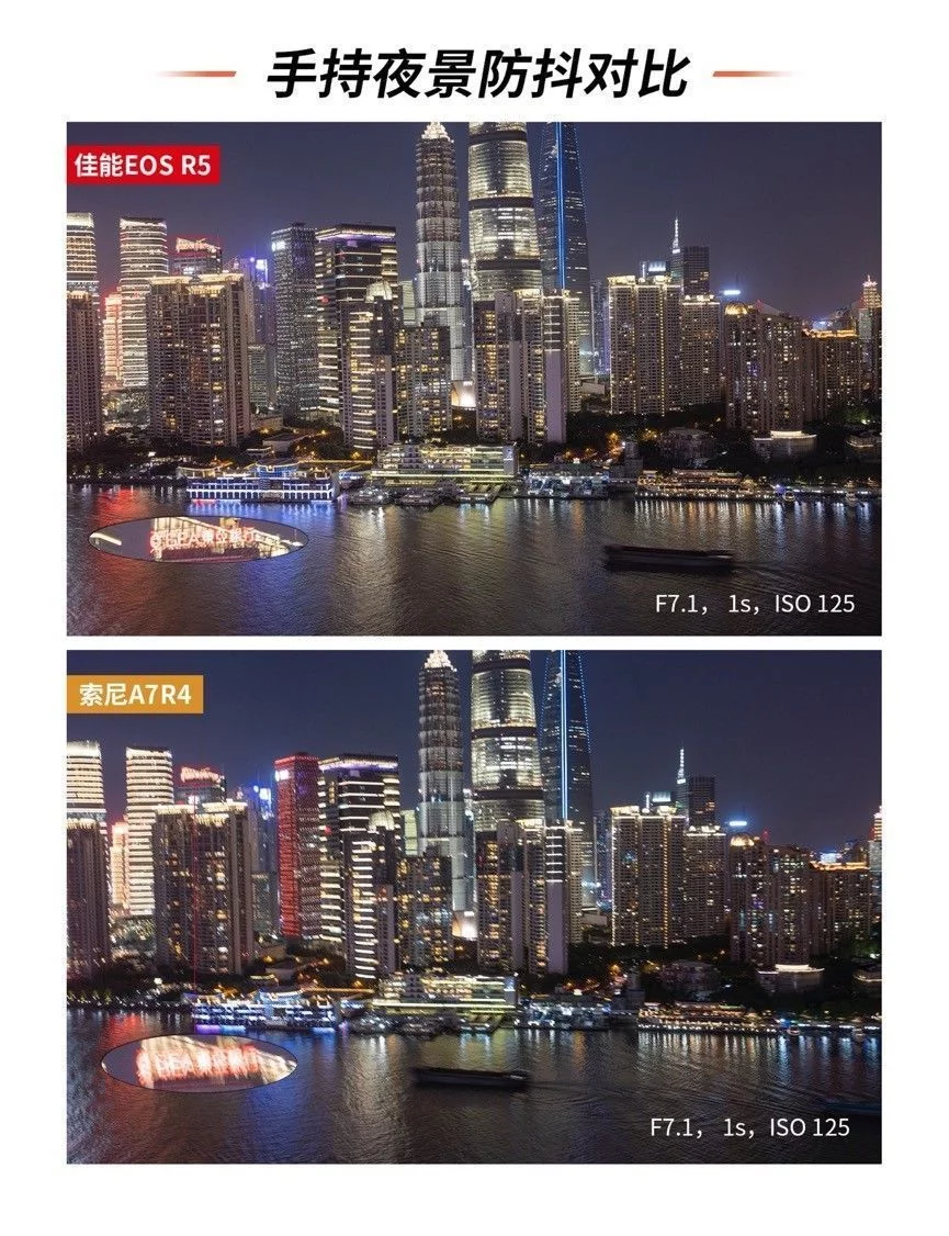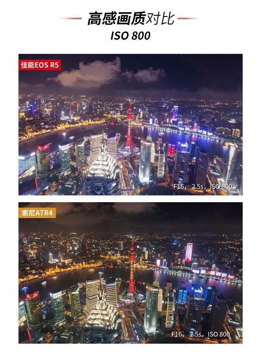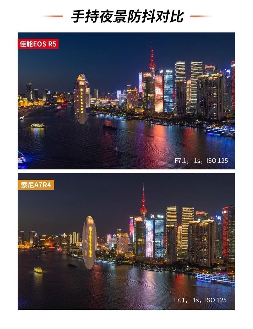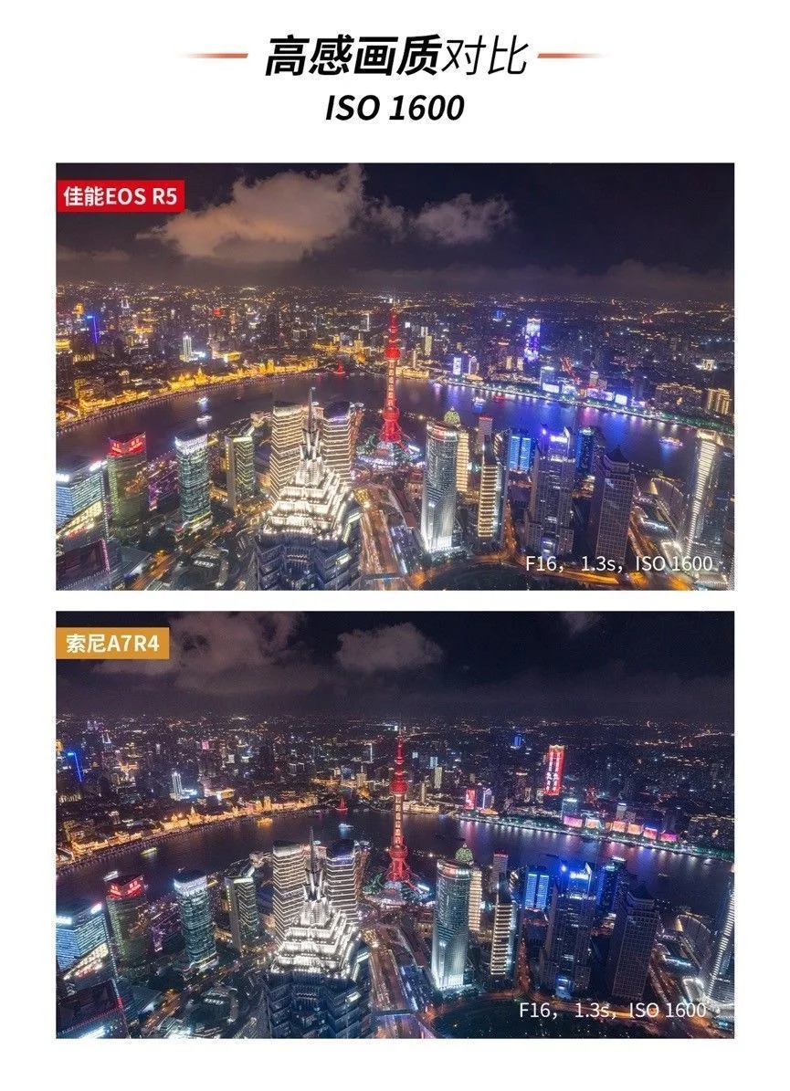 城市夜景是一个宽容度非常之高的摄影题材,专业的摄影师凭借其独特的角度与丰富的后期创意能给予城市夜景一个属于自己的风格诠释。而对于摄影爱好者或摄影小白来说,一台合适的相机搭配上一些预设的相机参数设置,以及适当的配件加持网红拍摄点的定点寻找,同样也能拍摄出令自己满意、令别人惊艳的照片。这个时候或许相机背后的思考并没有专业摄影师那么重要,反倒是手中的相机实用性成了决定性的因素。 既然如此,如何选择一台易用、实用的相机作为城市夜景的创作设备呢?它们需要有高像素去在必要时进行二次的裁切、它们需要有丰富的拍摄角度以应对不同取景下的画面表达。当然了还需要有一定的防抖性能以备特殊环境下的不时之需。 我们将相机的价格限定在2-3万,这个时候佳能的EOS R5与索尼A7R4便瞬间浮出水面。作为这个价位的主流无反相机,我们将对于这两台相机进行相同拍摄环境下的画面比较。同时,我们以魔都上海的一些拍摄限制为参考,通过最常见的夜景拍摄的防抖性能对比、夜景拍摄下的感光度表现以及夜景拍摄下的低角度拍摄可用性这些相对具有决定性的拍摄条件进行比较,那么这两款产品实际性能究竟如何?我们就从第一个防抖性能说起吧。 考验一、手持夜景下的 防抖对比 拍摄地点:上海英迪格酒店——恰咖啡厅 手持拍摄快门速度:1s 在最开始的城市夜景拍摄中,手持拍摄似乎和夜景并没有太多的关联,无论是胶卷相机还是后来的数码相机,人们都是习惯于将相机架设在三脚架上长时间曝光慢慢拍摄。即便拥有光学防抖功能,我们也还是会为了更好的画质而关闭相机的防抖功能。但是现如今手持防抖确实成为了城市夜景拍摄中不可或缺的一个重要功能。因为越来越多的高楼建起,越来越多的拍摄角度在鳞次栉比的高楼大厦的户外平台上。而这些地方都往往有一个共同的规定——不允许架设三脚架。 以我们拍摄取景地上海外滩的英迪格酒店而言就是明文规定不允许架设脚架拍摄的地点。尽管坐拥着极美浦东浦西两岸夜景,但为了楼底下行人的安全考虑此处只能手持拍摄,所以我们第一个考验项目手持拍摄我们就选择在了英迪格酒店。 拍摄样张一: 为了更好寻找参照物我们分别以对岸浦东的香格里拉酒店招牌以及东亚银行的的霓虹灯为拍摄参照物。手持拍摄都以1s为限定条件。两台相机都拥有5轴防抖功能,我们在实际拍摄中也将其各自拥有的5轴防抖打开已进行比较。 在第一项测试中,尽管索尼拥有着相对基础的5轴防抖性能,但是在手持1s的拍摄中还是出现了极为明显的抖动情况。无论是第一张图片中的香格里拉酒店还是第二张图中的BEA东亚银行字眼均无法在照片中得以辨识。而另一方面内置机身防抖功能的EOS R5可搭配实现最高8级的手抖动补偿效果。在搭配具有光学防抖的RF镜头时,机身防抖可与镜头光学防抖联动最高获得8级的手抖动补偿效果,这一点在两次拍摄时都获得了很好的印证。不得不承认在夜景防抖的拍摄对比下,佳能EOS R5显然更胜一筹。 考验二:高感画质对比 拍摄地点:浦东环球金融中心 高感对比其实是一个老生常谈的问题。从有数码相机开始,高感的控噪就成为了每个品牌都必须面对的问题。我们第二次的拍摄考验选择在了浦东环球金融中心的100层观光厅。这里是最好获得浦东夜景的常规景点之一。 相比于那些不太为人所知或者有一定风险性的拍摄地点。浦东环球金融中心,或许是最唾手可得的魔都美景地,但是这个地方同样有一个问题,那便是隔着双层玻璃需要贴近拍摄,尽管可以支撑三脚架但并不太好架设,所以适当的提高感光度成了这里比较常用的拍摄手法,既能避免抖动也可以快速拍摄。我们为了模拟真实的拍摄状态以ISO 800/ISO 1600/ISO 3200以及ISO 6400作为几档基础的拍摄选项进行拍摄,也可以看一下这两款相机在实际应用中的表现究竟如何。 从样图我们不难发觉,尽管索尼A7R4有着6100万有效像素的全画幅传感器,但这也成为了这款相机在弱光下以及高感下的一个死穴,佳能EOS R5尽管在ISO3200的情况下也出现了不同情况的噪点,ISO6400下有着些许色彩损失,但在控噪方面表现依然不俗。但是反观索尼A7R4在感光度为ISO1600的情况下噪点以及色彩损失都开始急速增加,而当感光度达到ISO6400时,画面质量已经下降到几乎不可用的状态。尽管有着高像素的加持,但是只能说是参数上的优势,夜景下的真正应用性几乎为零。 为了可以更好的客观对比,于是我们又寻找了几个拍摄机位,希望能有一个更全面的对比。在外滩的打卡地我们进行了又一次的尝试。 但实际的效果索尼的A7R4还是很难突破ISO6400临界点,这其实对于夜景拍摄来说会有一定的局限性,这点上佳能EOS R5就相对可用性强一些,即使是在ISO6400的高感光下还是可以有部分的细节,给予用户相对较大后期空间。 考验三:低角度夜景拍摄 拍摄地点:浦东地标建筑中心区域 这项测试其实对于索尼A7R4有些不公平,因为在实际操作中我们几乎无法用索尼的这台旗舰级产品进行拍摄,在拍摄低角度仰视的画面时,索尼A7R4的折返液晶屏完全处于无法使用的状态。在遇到一些需要仰视进行拍摄的画面时,这款相机可以说是不可用。 反观佳能EOS R5侧翻转液晶屏的易用性就相当强,不仅可以应对低角度拍摄,在一些竖拍镜头时也游刃有余。两台相机的