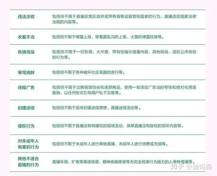 违法涉政:包括但不限于直播反党反政府或带有侮辱诋毁党和国家的行为、直播违反国家法律法规的内容等。