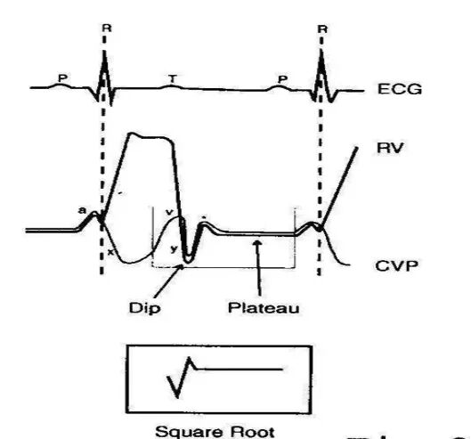 03 心脏限制的病理生理学 心脏限制时,心室压力舒张早期下陷,表明主动松弛功能正常,心室压力中晚期上升,一直持续到下一个心动周期开始,形成舒张中晚期平台,表明心脏舒张受到限制;心室压力曲线形成平方根样图形(图3)。