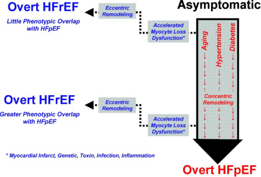 图4. DHF与SHF的关系 ▼参考文献 1.  onikowski P, Voors AA, Anker SD, et al. 2016 ESC Guidelines for the diagnosis and treatment of acute and chronic heart failure: The Task Force for the diagnosis and treatment of acute and chronic heart failure of the European Society of Cardiology (ESC)Developed with the special contribution of the Heart Failure Association (HFA) of the ESC.Eur Heart J.2016;37(27):2129-2200. 2. Triposkiadis F, Butler J, Abboud FM, et al. The continuous heart failure spectrum: moving beyond an ejection fraction classification.Eur Heart J.2019;40(26):2155-2163. 3. Iwano H, Little WC. Heart failure: what does ejection fraction have to do with it?J Cardiol. 2013;62(1):1-3. 4. Mann DL. Is It Time for a New Taxonomy for Heart Failure?J Card Fail.2016;22(9):710-712. 5. Marwick TH. Ejection Fraction Pros and Cons: JACC State-of-the-Art Review.J Am Coll Cardiol. 2018;72(19):2360-2379. 6. Konstam MA, Abboud FM. Ejection Fraction: Misunderstood and Overrated (Changing the Paradigm in Categorizing Heart Failure).Circulation.2017;135(8):717-719. 7. van Riet EE, Hoes AW, Wagenaar KP, et al. Epidemiology of heart failure: the prevalence of heart failure and ventricular dysfunction in older adults over time. A systematic review.Eur J Heart Fail.2016;18(3):242-252. 8.  ieske B, Tschope C, de Boer RA, et al. How to diagnose heart failure with preserved ejection fraction: the HFA-PEFF diagnostic algorithm: a consensus recommendation from the Heart Failure Association (HFA) of the European Society of Cardiology (ESC).Eur Heart J.2019;40(40):3297-3317. 9. Zile MR, Baicu CF, Gaasch WH. Diastolic heart failure--abnormalities in active relaxation and passive stiffness of the left ventricle.N Engl J Med. 2004;350(19):1953-1959. 10. Grossman W. Why is left ventricular diastolic pressure increased during angina pectoris? .J Am Coll Cardiol.1985;5:607–608. 11. Morgan JP, Erny RE, Allen PD, et al. Abnormal intracellular calcium handling, a major cause of systolic and diastolic dysfunction in ventricular myocardium from patients with heart failure.Circulation.1990;81(2 Suppl):III21-32. 12. Westermann D, Kasner M, Steendijk P, et al. Role of left ventricular stiffness in heart failure with normal ejection fraction.Circulation.2008;117(16):2051-2060. 13. Borlaug BA, Jaber WA, Ommen SR, et al. Diastolic relaxation and compliance reserve during dynamic exercise in heart failure with preserved ejection fraction.Heart.2011;97(12):964-969. 14. Eichhorn EJ, Willard JE, Alvarez L, et al. Are contraction and relaxation coupled in patients with and without congestive heart failure?Circulation.1992;85(6):2132-2139. 15. Sharma K, Kass DA. Heart failure with preserved ejection fraction: mechanisms, clinical features, and therapies.Circ Res. 2014;115(1):79-96. 16.  agel PS, Tawil JN, Boettcher BT, et al. Heart Failure With Preserved Ejection Fraction: A Comprehensive Review and Update of Diagnosis, Pathophysiology, Treatment, and Perioperative Implications. J Cardiothorac Vasc Anesth. 2020. 17. van Heerebeek L, Borbely A, Niessen HW, et al. Myocardial structure and function differ in systolic and diastolic heart failure.Circulation.2006;113(16):1966-1973. 18. van Heerebeek L, Hamdani N, Falcao-Pires I, et al. Low myocardial protein kinase G activity in heart failure with preserved ejection fraction.Circulation.2012;126(7):830-839. 19. Toledo C, Andrade DC, Lucero C, et al. Cardiac diastolic and autonomic dysfunction are aggravated by central chemoreflex activation in heart failure with preserved ejection fraction rats.J Physiol.2017;595(8):2479-2495. 20. Sanderson JE. Factors related to outcome in heart failure with a preserved (or normal) left ventricular ejection fraction.Eur Heart J Qual Care Clin Outcomes.2016;2(3):153-163. 21. Kalogeropoulos A, Georgiopoulou V, Psaty BM, et al. Inflammatory Markers and Incident Heart Failure Risk in Older Adults The Health ABC (Health, Aging, and Body Composition) Study.Journal of the American College of Cardiology.2010;55(19):2129-2137. 22.  utko BN, Wang Z, Lo J, et al. Circulating levels of tumor necrosis factor-alpha receptor 2 are increased in heart failure with preserved ejection fraction relative to heart failure with reduced ejection fraction: evidence for a divergence in pathophysiology.PLoS One.2014;9(6):e99495. 23. Sanders-van Wijk S, van Empel V, Davarzani N, et al. Circulating biomarkers of distinct pathophysiological pathways in heart failure with preserved vs. reduced left ventricular ejection fraction.Eur J Heart Fail. 2015;17(10):1006-1014. 24. Borbely A, van der Velden J, Papp Z, et al. Cardiomyocyte stiffness in diastolic heart failure.Circulation. 2005;111(6):774-781. 25. Gonzalez A, Lopez B, Querejeta R, et al. Filling pressures and collagen metabolism in hypertensive patients with heart failure and normal ejection fraction.Hypertension. 2010;55(6):1418-1424. 26. Shah SJ, Lam CSP, Svedlund S, et al. Prevalence and correlates of coronary microvascular dysfunction in heart failure with preserved ejection fraction: PROMIS-HFpEF.Eur Heart J.2018;39(37):3439-3450. 27. Crea F, Bairey Merz CN, Beltrame JF, et al. The parallel tales of microvascular angina and heart failure with preserved ejection fraction: a paradigm shift.Eur Heart J.2017;38(7):473-477. 28. Mohammed SF, Hussain S, Mirzoyev SA, et al. Coronary microvascular rarefaction and myocardial fibrosis in heart failure with preserved ejection fraction.Circulation. 2015;131(6):550-559. 29. Borbely A, Falcao-Pires I, van Heerebeek L, et al. Hypophosphorylation of the Stiff N2B titin isoform raises cardiomyocyte resting tension in failing human myocardium.Circ Res. 2009;104(6):780-786. 30. Zile MR, Baicu CF, Ikonomidis JS, et al. Myocardial stiffness in patients with heart failure and a preserved ejection fraction: contributions of collagen and titin.Circulation.2015;131(14):1247-1259. 31.  agel PS, Kehl F, Gare M, et al. Mechanical function of the left atrium: new insights based on analysis
